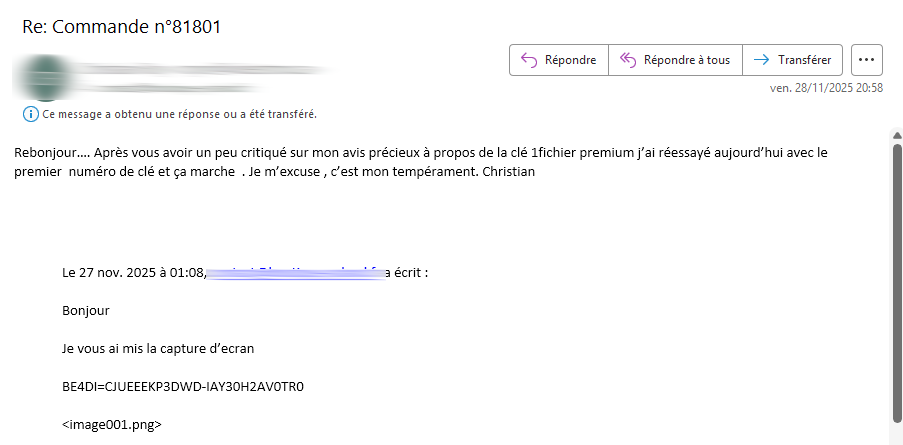 Tout à fait, c'est connu que les clés que je vends sont erronées, il me semble que vous venez de venir pleurer par mail pour me dire que finalement le voucher fonctionne ? je vous laisse avec une capture d'écran ( https://www.boutique-pcland.fr/wp-content/uploads/2025/11/commande-81801.png ) . Comme vous le savez déjà, donc vous êtes banni, ainsi que votre IP ! ça va être compliqué pour venir à nouveau commander !